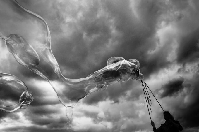 L’immagine dell’ uomo davanti alla sorpresa di queste strane forme, che in un attimo scompaiono, non ha limiti : queste forme fluttuanti nello spazio danno corpo a sogni e inquietudini .