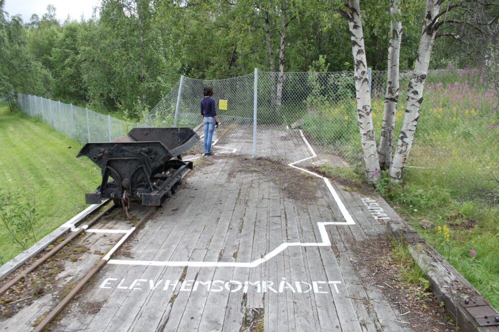 A Malmberget c’è un’area chiamata Shantytown che è stata costruita come una sorta di ambigua ricostruzione della città vecchia, in occasione della celebrazione del centenario dalla fondazione, con l’intento di ridare vita a una parte importante della storia del paese. Alla fine della cittadella ricostruita, si trova una piattaforma di legno che fa da base a un antico pezzo di binario ferroviario e un vagone, simboli del sistema di trasporto del minerale di ferro grezzo. Oggigiorno, la piattaforma è stata parzialmente inglobata dall’area recintata. Per me, questo sito appare come una chiara metafora della relazione tra gli abitanti di Malmberget e l’area della miniera.