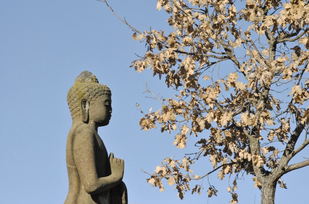 Dharma, Le cose così come sono. La legge naturale che governa la nostra vita, insieme al karma. E se questa parola la colleghiamo a Buddha, il Buddharma, ecco che diventa l’insegnamento di Buddha, un Risvegliato che ha indicato una via, un cammino utile alla traversata. Dalla giovinezza alla vita meditativa, il Buddha resta lì immobile davanti al grande fiume come in meditazione. Il sole scende per lasciare spazio al buio, una luce che staglia il cielo, quei colori vivi ancora che illuminano. Ecco l’Illuminazione, colui che si è risvegliato alla verità o alla legge della vita, il Dharma appunto. Questa verità è eterna e senza limiti.