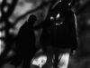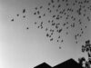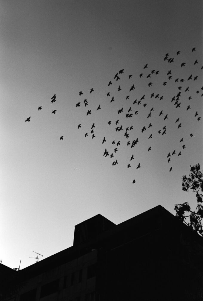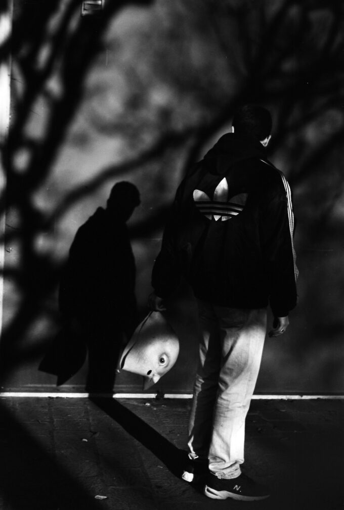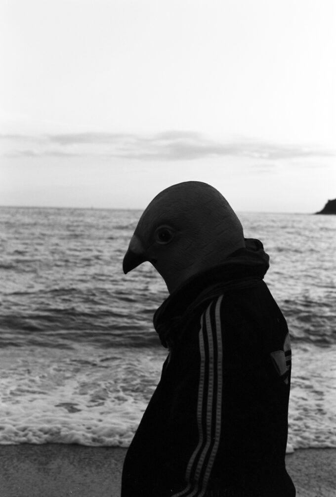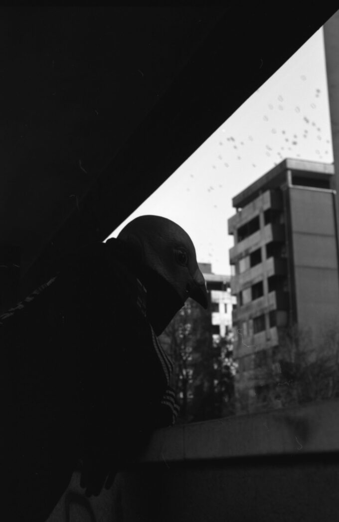 Né uomo né piccione. La figura al centro del progetto rappresenta l’idea di ibrido. Se uno stormo di piccioni è metaforicamente un blocco culturale ben distinto all’interno di un contesto culturale nazionale più ampio, l’ibrido è l’intenzione individuale di aprirsi al mondo. Le foto vogliono raccontare dei frammenti della vita dell’ibrido che, nonostante la propria volontà di aprirsi, si trova solo nell’intersezione tra il mondo di provenienza e quello di approdo che lo vede con occhi diffidenti. La scelta della maschera è ricaduta sul piccione perché è un uccello che una volta popolato un luogo non migra ma tende a sedimentarsi. Il progetto è totalmente realizzato in analogico, dagli scatti, alla stampa a ingranditore in camera oscura. Questo sia per una ricerca personale come neofita della fotografia analogica, sia, insieme alla scelta dei rullini e dei luoghi degli scatti, per cercare di restituire la solitudine che vive il protagonista. I rullini utilizzati sono tre, tutti bianco e nero, un Rollei retro400, un Ferrania P30 e un Kodak T-max400. Ho cercato di ottenere un contrasto alto scattando in giornate di sole in modo che le ombre risultassero piene.